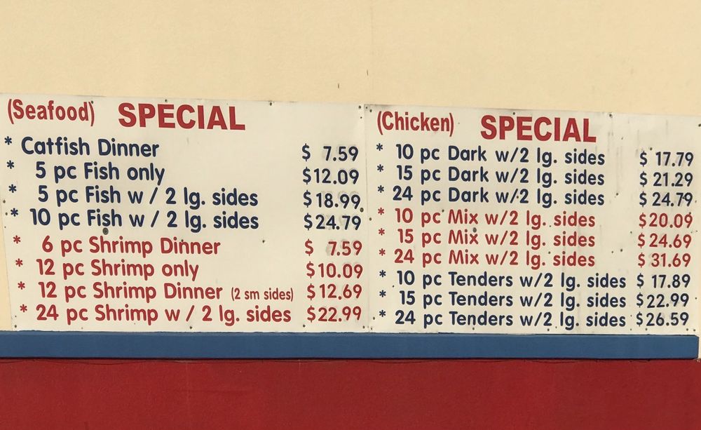 Your choice of , , , , or pc hand battered fried fish filets, side items of your choice, with dinner roll(s). (Drink not included.)